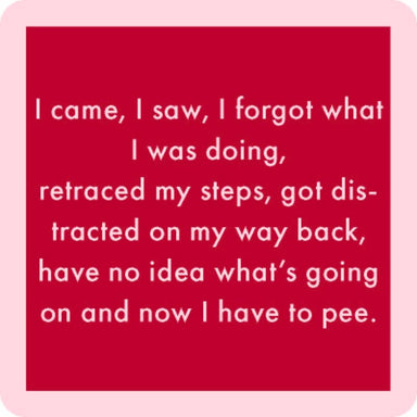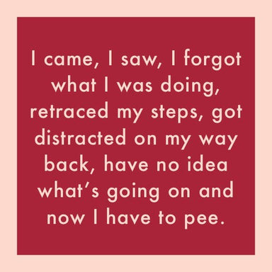“I came, I saw, I forgot what I was doing, retraced my steps, got distracted on my way back, have no idea what’s going on and now I have to pee.” ...