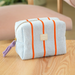 Toss your must-haves into this charming soft blue terry pouch and watch the magic happen! Adorned with cheerful orange embroidery, it's your new go-to for corralling makeup, skincare products, jewelry, pens, tech cables—basically anything that needs a cozy home. Compact yet surprisingly spacious, this little organizer keeps the chaos at bay while looking absolutely adorable doing it.