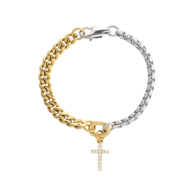 Why choose one metal? End the gold-vs-silver drama with a bracelet that gives you the balance. A perfect mix of gold and silver, with a cross charm...