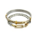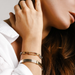 The Ischia Bracelet Stack features a stainless steel chain adorned with zirconia and finished with 18k gold plating. The stack measures 7" in length and 7mm in width, complemented by an 18K gold plated stainless steel bangle sized 2.8" x 1.77", designed to fit wrists up to 6.5” comfortably. This playful set adds a touch of sparkle and elegance to your wrist.