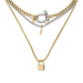 The Herradura Lock Layered Necklace Set elevates your everyday look with four bold chains, featuring our best-selling Herradura Necklace alongside lock and lightning pendants. Combining edgy details with timeless style, this set is designed to stand out and effortlessly enhance any outfit.