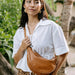 This rich brown leather crescent purse can be worn as a long shoulder bag or crossbody bag, or adjusted to be worn close to the body as a stylish sling bag. A convertible bag with a slim silhouette, the Crescent Sling is as sturdy as it is chic.