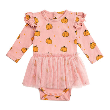 Celebrate fall in style with the Pumpkin Blush Long Sleeve Tutu Bodysuit! This adorable blush-colored outfit features festive orange and brown grap...