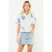 Crisp white button-down with a charming collar, adorned with oversized embroidered blooms in navy blue. The playful scalloped hem adds a whimsical touch that's perfect for elevating your everyday style with a pop of botanical flair.