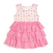 This darling dress combines a sweet, soft printed top with three dazzling layers of pink tulle, making every twirl a magical moment.