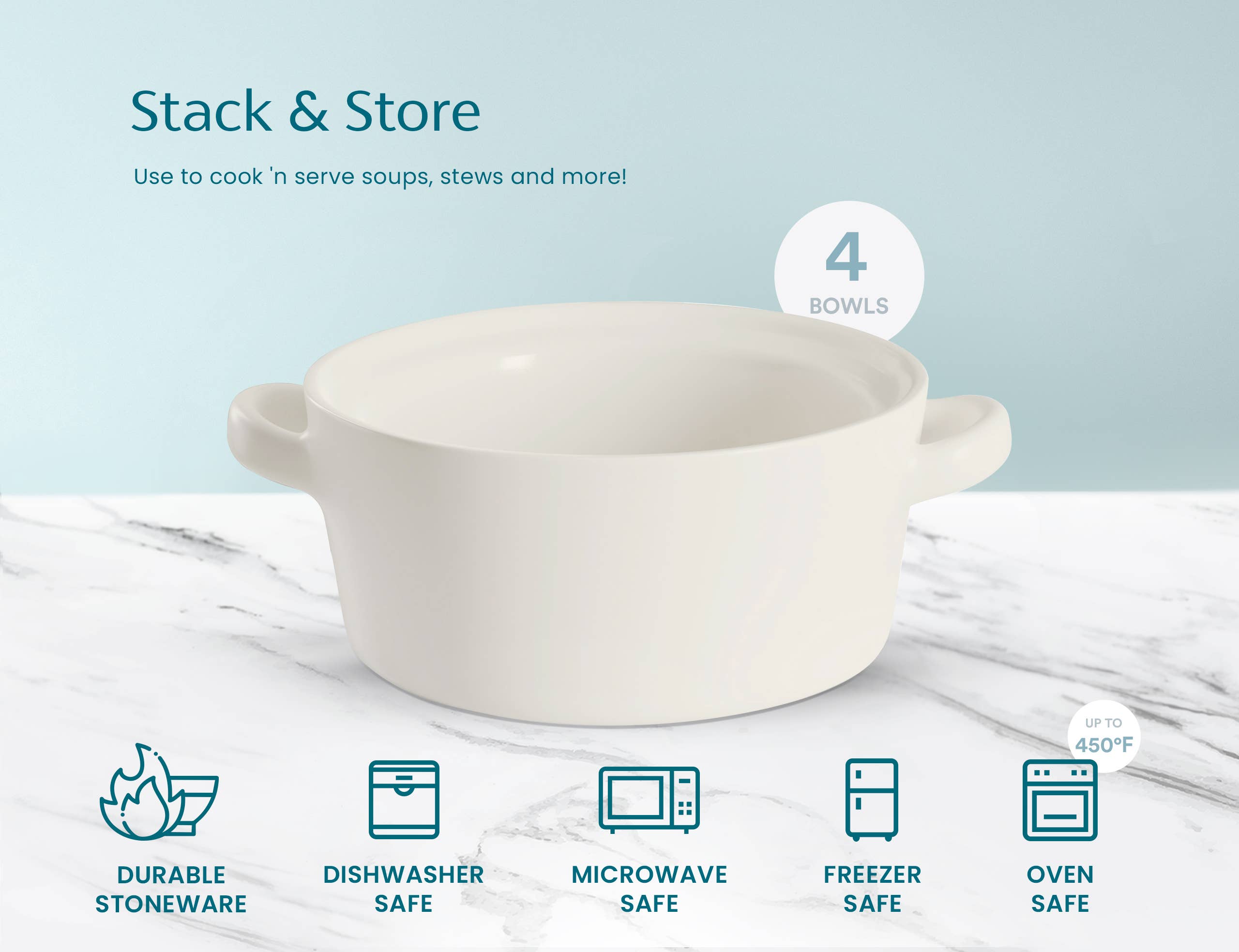 Soups, Stews & More! These ceramic crocks are perfect for cooking up individual servings of pot pies, chili, stews, casseroles, or our personal favorite; gooey, cheesy French Onion. Each crock is designed with two large, comfort-grip handles for easy and safe carrying from oven to table, and stack snugly for space saving storage.