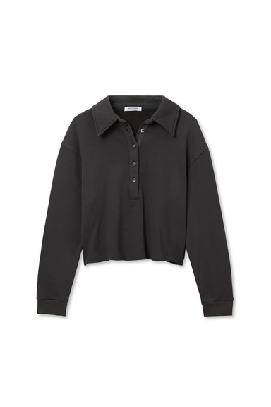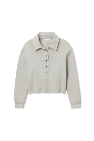 the vinny top is crafted from heavy fleece and finished with a raw hem for a relaxed, lived-in look. designed with a collared neckline and button p...