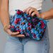 Toss your essentials into this cheerful travel companion! Featuring a rich blue velvet exterior with a vibrant floral pattern, this compact pouch keeps your belongings organized and stylish. The secure zipper top ensures nothing goes missing on your adventures. Perfect for cosmetics, jewelry, or tech accessories, its 7" x 8" x 3.5" size fits easily into any bag or carry-on.