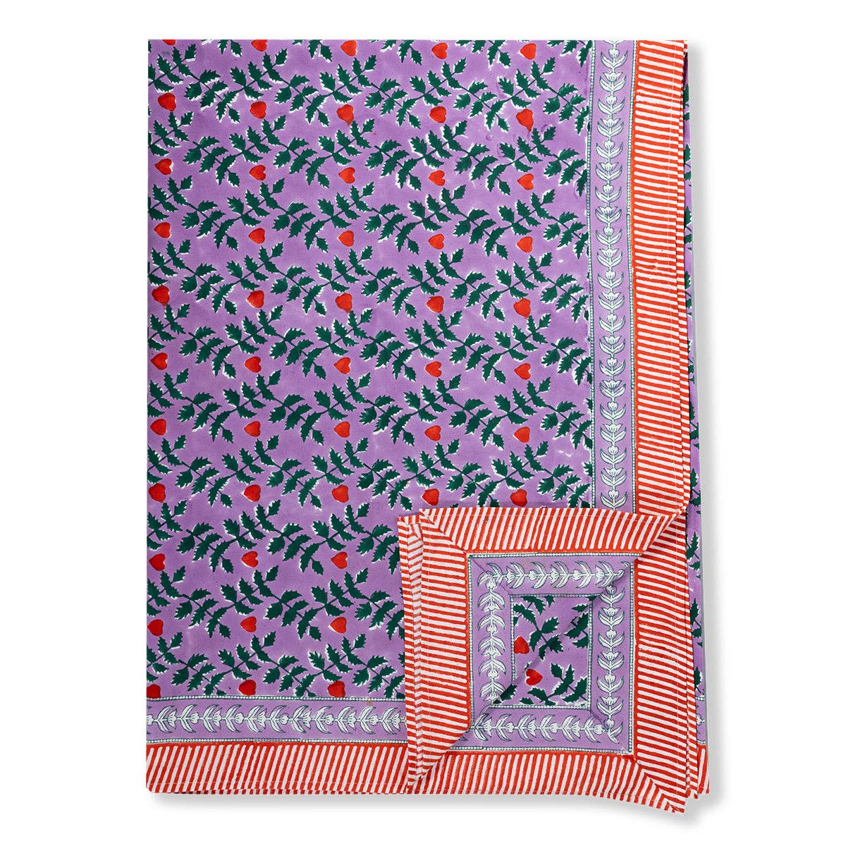 Make your meals extra festive with our exclusive blockprint rectangle tablecloth. Handmade in India, the charming color combo and the striped scalloped trim make a bold statement. By opting for sustainable table linens over disposable, we can help cut down on waste and support an age-old craft by artisans in Jaipur.