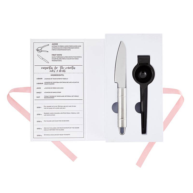 On the rocks or frozen!? This margarita kit is essential to any bar setup. Book set includes citrus juicer, knife, and yummy recipe! • Material: Metal/Stainless Steel • Size: 6" x 11" H • Care Instructions: Hand Wash Only