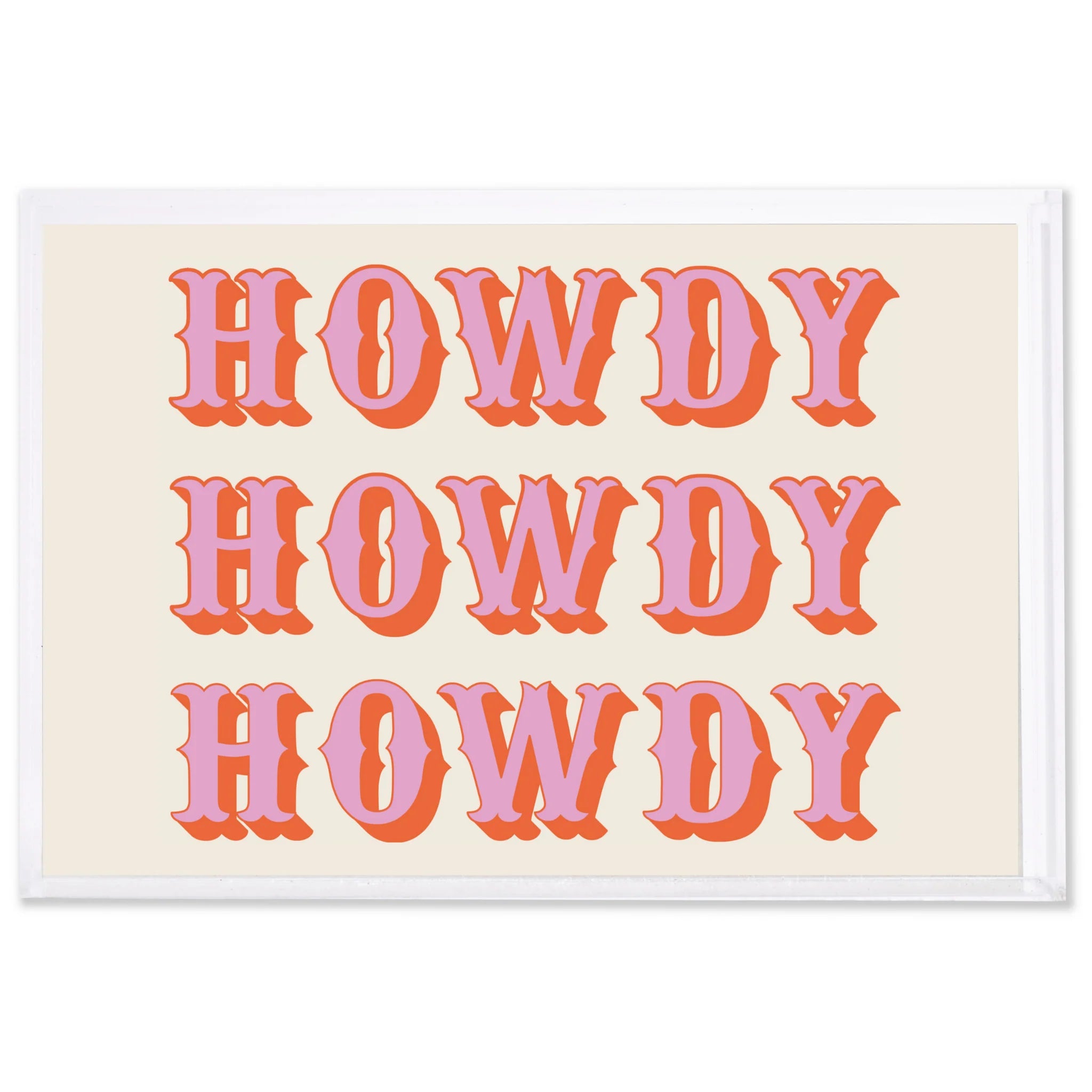 Let's get this party started with our acrylic Howdy tray! This serving acrylic tray is sure to liven up any bar hosting event with its fun play on words. Perfect for making everyone feel welcomed and cozy, Howdy will make you say yeehaw! (But just two yeehaws max!)